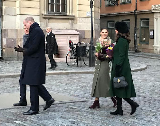 Earlier today, the couple had lunch at the Royal Palace in Stockholm, where they met King Carl XVI Gustaf and Queen Silvia and Crown Princess Victoria and Prince Daniel. After the lunch, the Crown Princess and Prince Daniel and the Duke and Duchess of Cambridge emerged from the palace for a short walk to Stortoget, the square in Gamla Stan (Old Town) to visit the Nobel Museum.