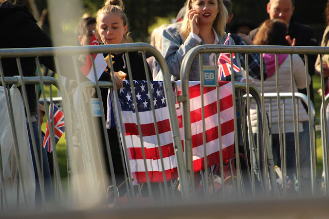 It was about 9 a.m,. that we learned that the Queen created Harry as Duke of Sussex, Earl of Dumbarton and Baron Kilkeel. We cleaned up our area to make sure we would not lose the cherished position by the barriers. Police lined the route and armed officers with huge guns walked up and down the Long Walk.