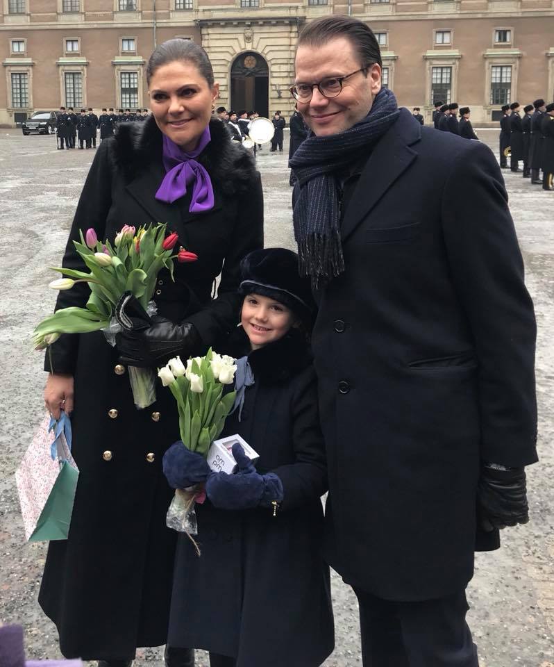 Crown Princess Victoria of Sweden celebrated her Name Day today outside in the courtyard at the Royal Palace. She was accompanied by her husband, Prince Daniel. and their six-year-old daughter, Princess Estelle.