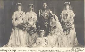 Princess Patrica of Connaught walked behind her sister, assisting with the train, was dressed, along with the three bridesmaids, "in the palest shade of St. Patrick's blue. carrying white bouquets tied with ribbon of St. Patrick's blue, wearing white circular wreaths."