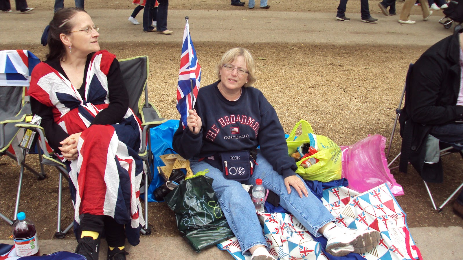 I don't think anyone on the Mall sat down for the concert as we were all up and about, dancing to the music, and giving shouts when the hosts acknowledged the crowd on the Mall. After the concert was over, those who were staying the night were advised to move into St. James's Park. A group of us, including my neighbors, the mom and her daughter, decided to move closer to Buckingham Palace . We were now on the other side of Clarence House, still on the St. James's Park side. We had to move away from the street as the double barriers were put up during the night. At first the police would not allow us to move back closer to the barriers (so we could protect our turf to be in the front for the procession), but eventually, we were able to move toward the barrier. All told, the police had us move about five times .. from the barriers to the park to the sidewalk, and finally were we wanted to be.