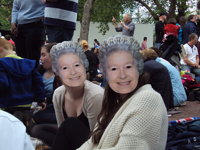 As Green Park was closed, we were directed to head toward St. James's Park via St. James's Place. My bag was inspected as I entered the Mall, which was filling up fast. I had not realized that there were television screens up and down the Mall, where people could watch the concert at Buckingham Palace. I had not realized that this was going to happen ... a nice bonus for Monday night. I found a nice space on the Mall across from Clarence House. My neighbors were a nice mom and daughter, who were also spending the night. They had an extra blanket which they offered for me to use. I put it under the floatie. I shared my tea cakes with people around me. Wish I had some right now.