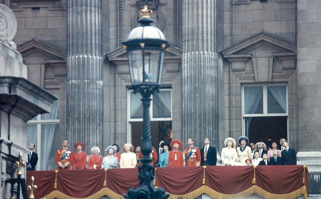 And the balcony appearance -- no super long lens for me in 1992, but you can see at the bottom right a little girl in a red hat -- that's the Hon. Leonora Knatchbull, youngest child of the then Lord and Lady Romsey (now Lord and Lady Brabourne.) She died later that year from cancer.