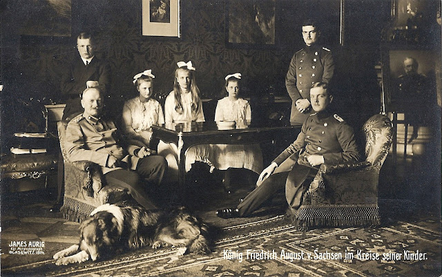 Two different images of King Friedrich of Saxony and his family, taken in 1914. Take note: the King and the dog are in the same position in both photos.