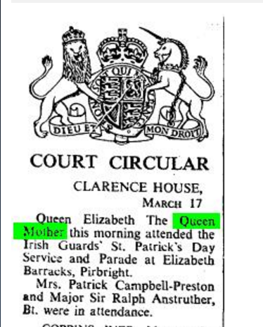 Far too many articles were plonked out with incorrect information that distaff members of the British Royal Family have been doing the shamrock presentations annually since 1901. I have provided examples and citations to show that this statement is far from true. It was not until the late 1960s when the Queen Mother succeeded the Princess Royal that the presentation became a true annual royal engagement. She made it her own, and she was loved and respected by members of the Irish Guard.