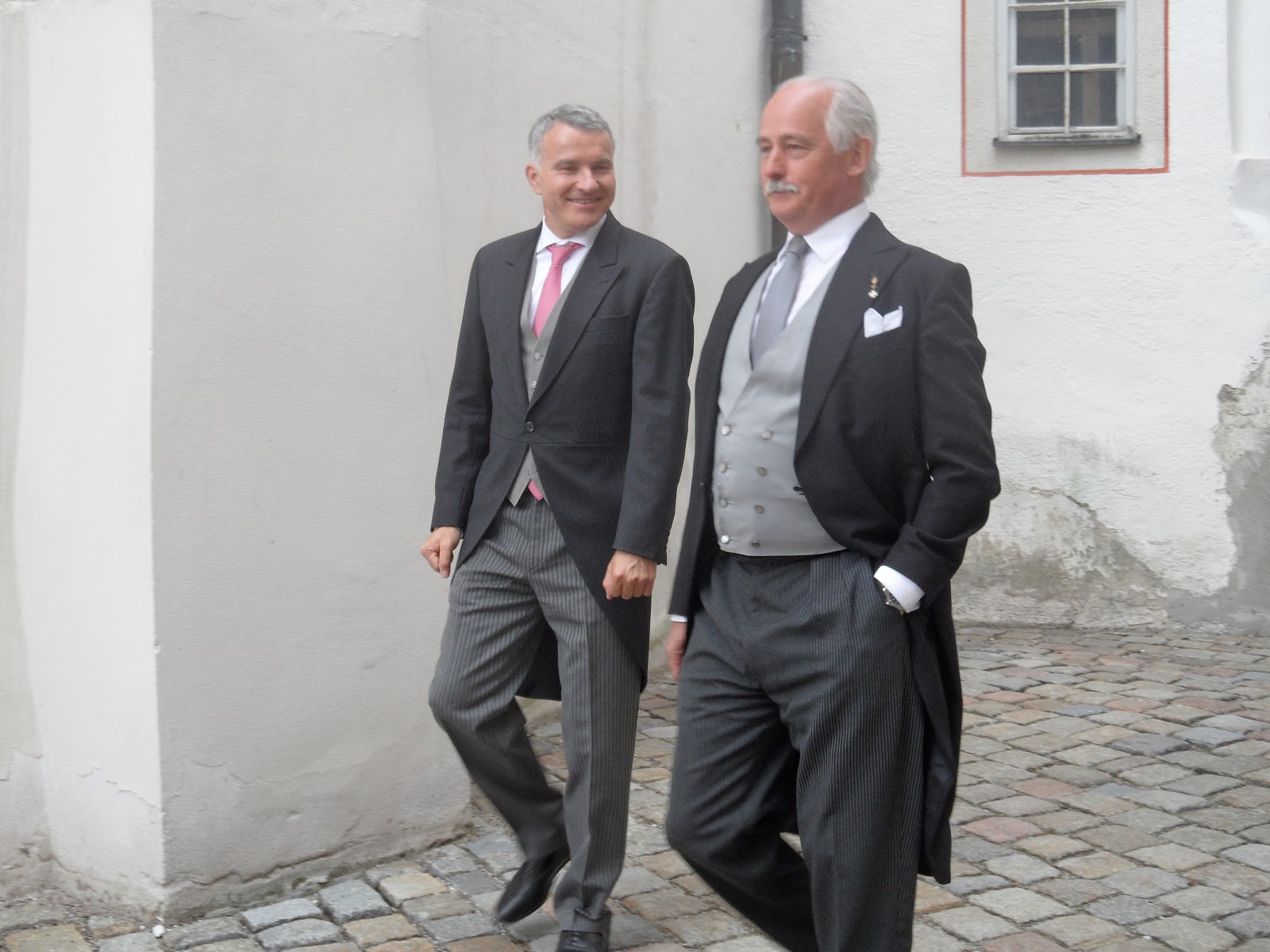 Blue was the color of the day. The Hereditary Prince wore a dark blue suit with an orange handkerchief in the top pocket of the jacket. Princess Victoria Luise chose a sky-blue jacquard dress, which was complemented by silver pumps. She carried a small bouquet that included pink roses, peonies and lily-of-the valley.