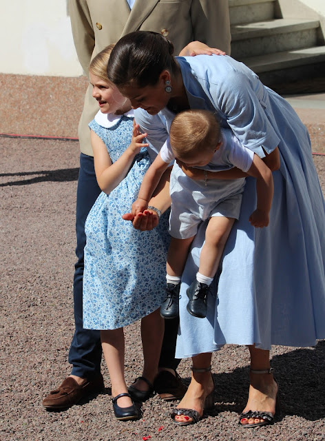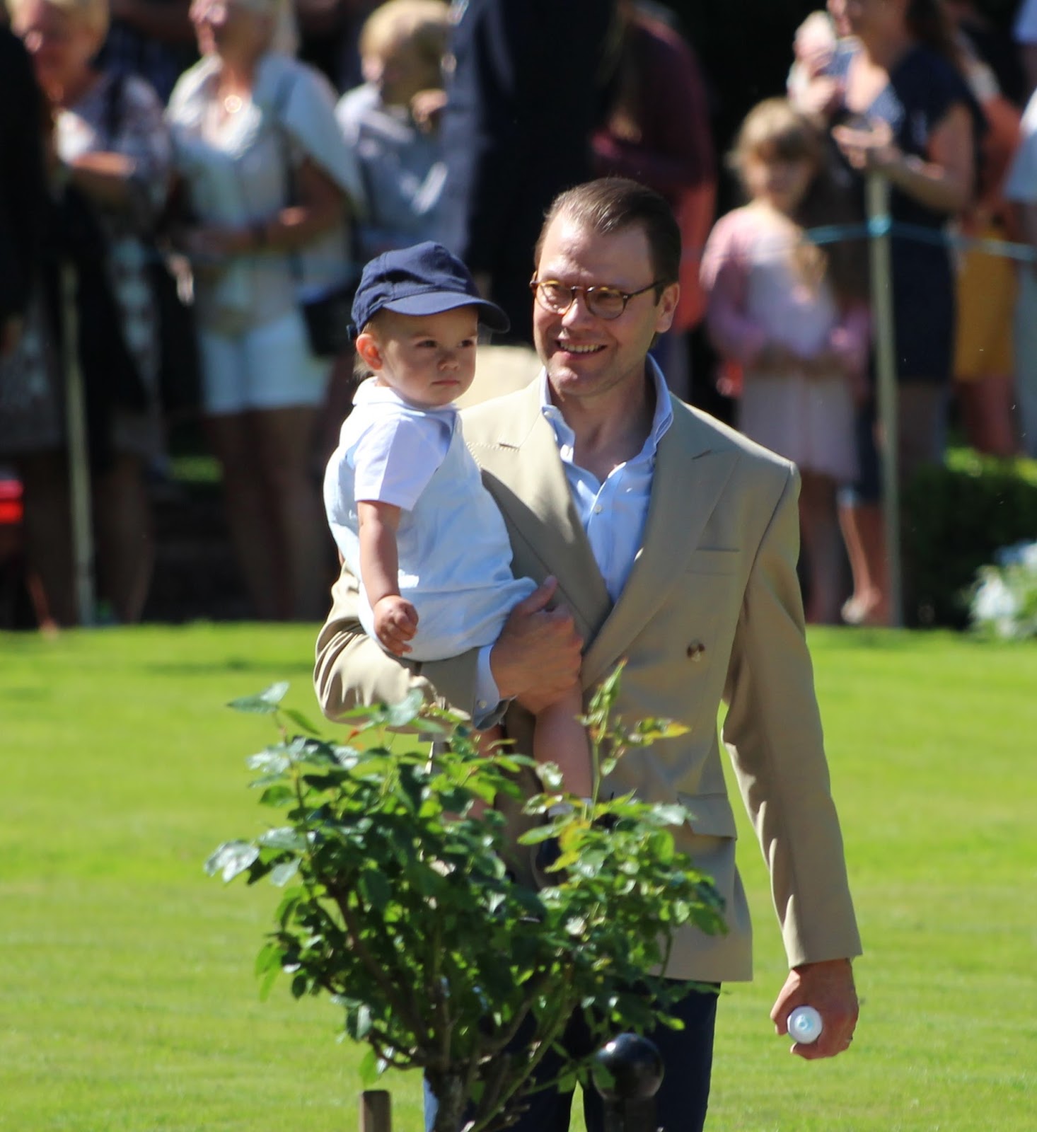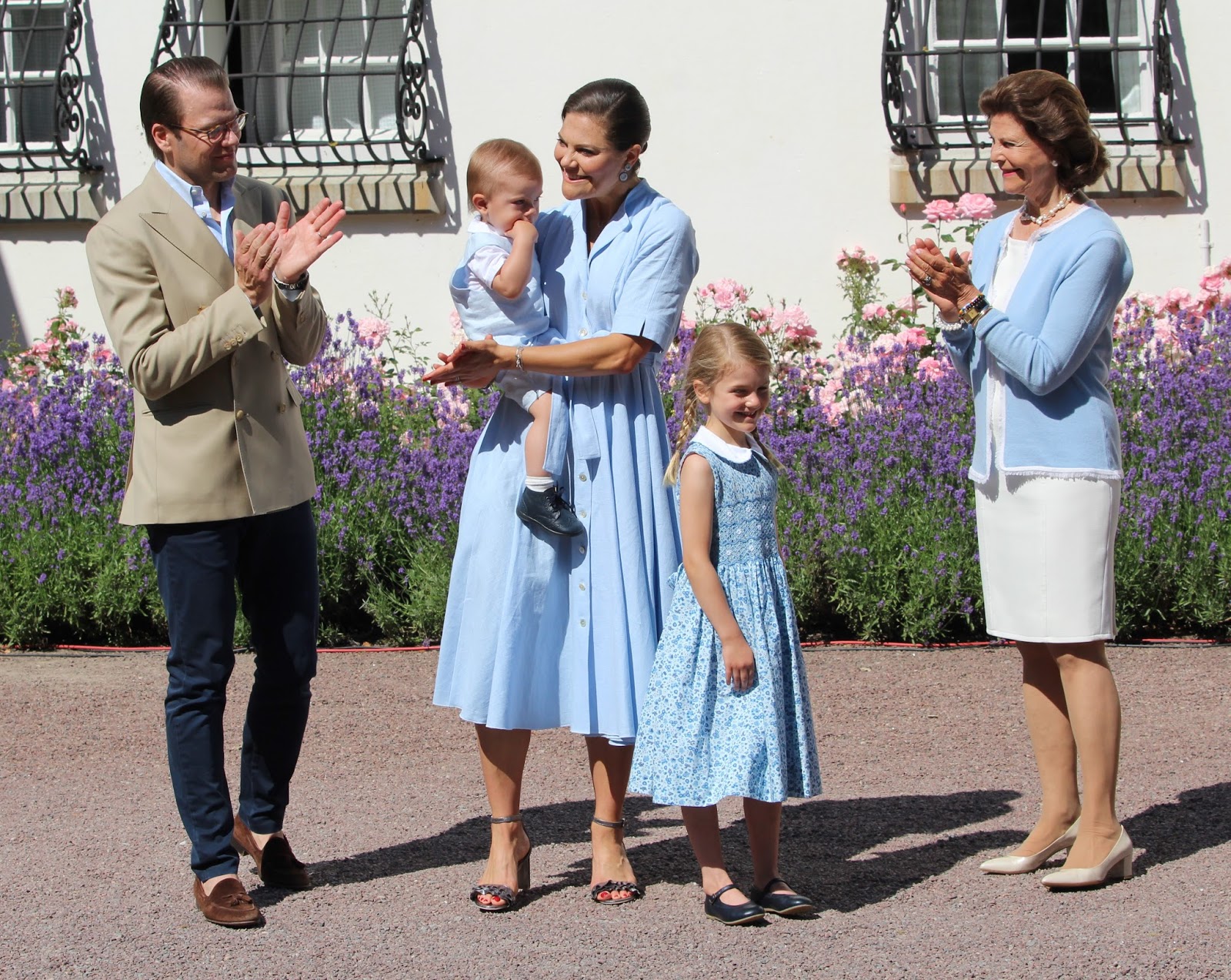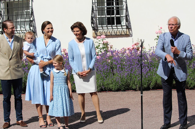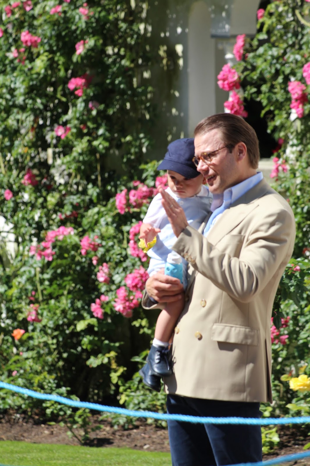 July 15, 2017. Victoria's birthday celebration at Solliden castle, the royal family's summer home on Öland. For the first time ever, guests had to go through a bag check before entering the grounds. The King and Queen and Crown Princess Victoria, Prince Daniel, Princess Estelle and Prince Oscar came out at 11 am. The crowd was at least six deep. It took the Crown Princess about 2 hours to make her way through both sides, greeting people, accepting presents, and posing for selfies. Estelle and Oscar posed for photos, greeted a few people before deciding they wanted to go inside.