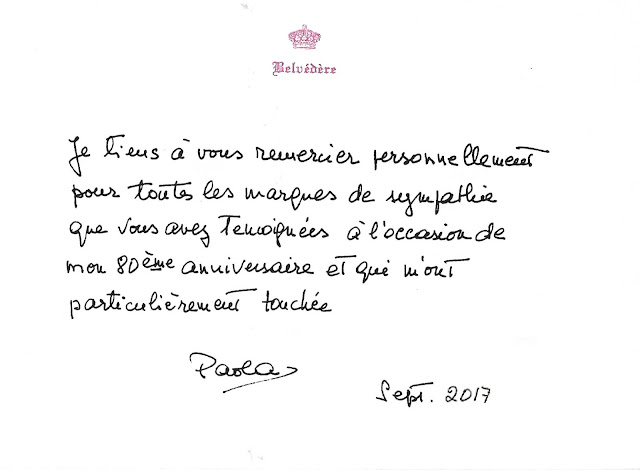 A nice thank you card from Queen Paola (80th birthday). She is surrounded by her family, children, and grandchildren and great-grandaughter ... but can you spot who is missing from the photo?