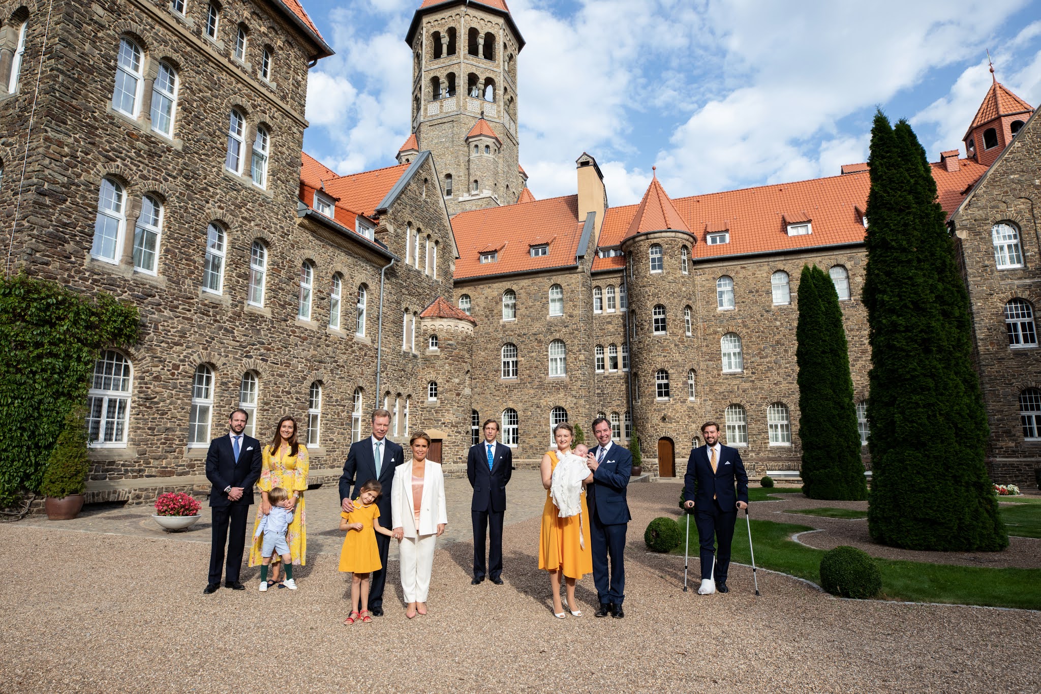 Hereditary Grand Duke Guillaume and Hereditary Grand Duchess Stephanie joined other members of the Luxembourg Grand Family at the celebration of the baptism of their four-month-old son Charles Jean Philippe Joseph Marie Guillaume on September 19 at L'abbaye St Maurice in Clervaux in the northern part of Luxembourg.